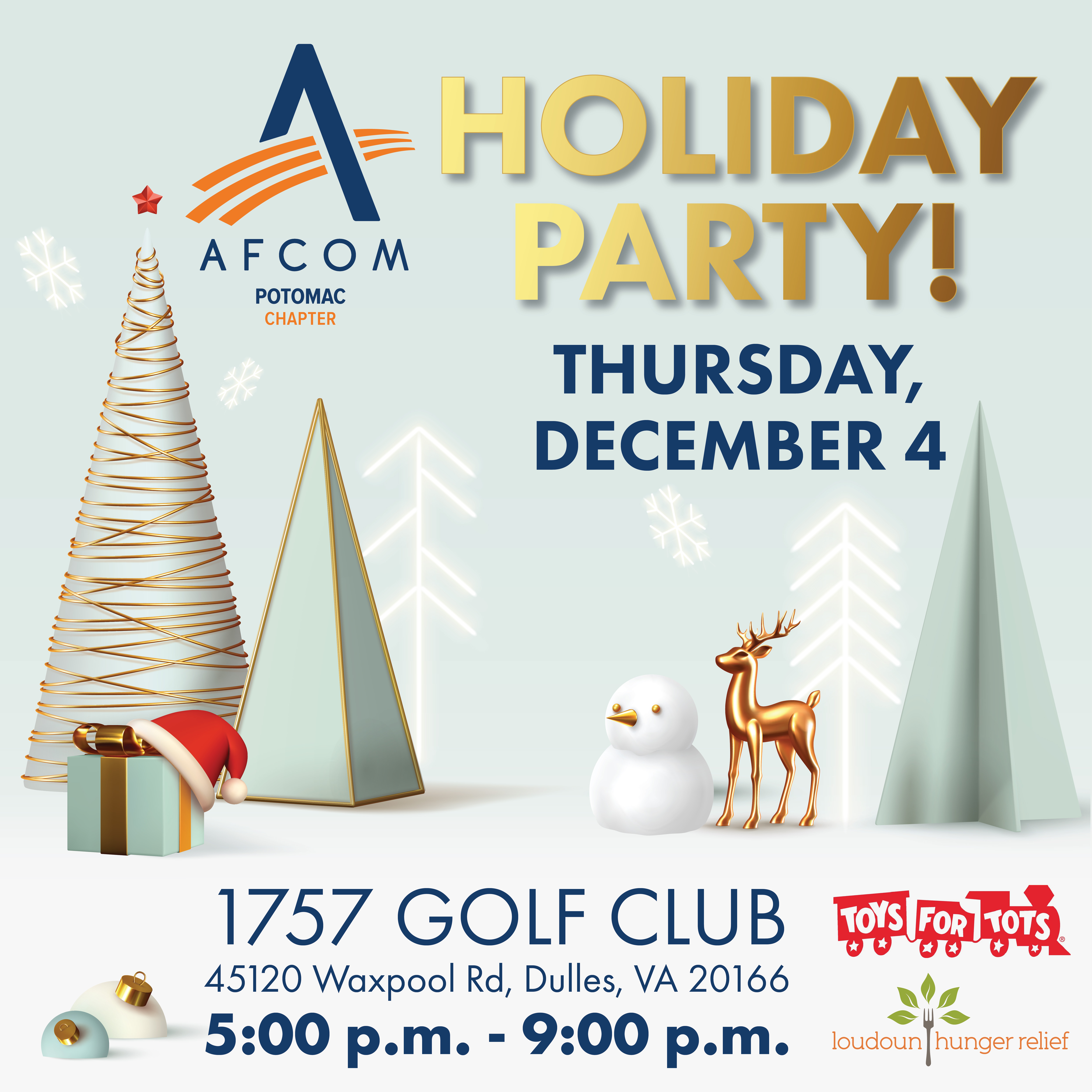 Giving Back: We're proud to support our community this holiday season! Please consider bringing: * New, unwrapped toys for Toys for Tots * Monetary donations or non-perishable food items for Loudoun Hunger Relief Registration: AFCOM Members: FREE | Non-Members: $50 Sponsorship Opportunities Available: Interested in sponsoring this event? We'd love to discuss how your organization can be part of this special evening while gaining visibility within our community. Sponsor now! Make sure to emailjennifer@paperfishcreative.com when you complete your sponsorship to send your current logo. Don't miss this chance to celebrate the season while making a difference in our community. We look forward to seeing you there!