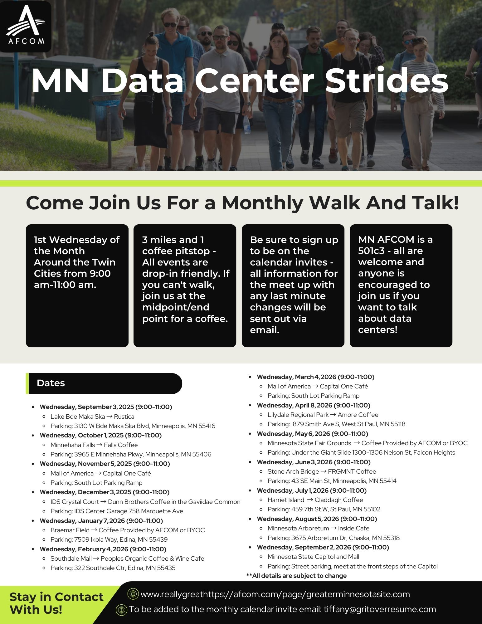 Join Us For MN Data Center Strides! Step away from your desk and join us for MN Data Center Strides, a refreshing monthly “Walk and Talk” where networking meets wellness. Held on the first Wednesday of each month, these casual 3-mile walks (with a coffee pitstop, of course) bring together professionals from across the Twin Cities data center community. Whether you join for the full walk or just meet up at the coffee stop, it’s a drop-in-friendly way to connect, share ideas, and build relationships. Hosted by MN AFCOM, these gatherings are open to everyone, no matter your role or level of experience. So come walk, talk, and be part of the conversation shaping the future of data centers!