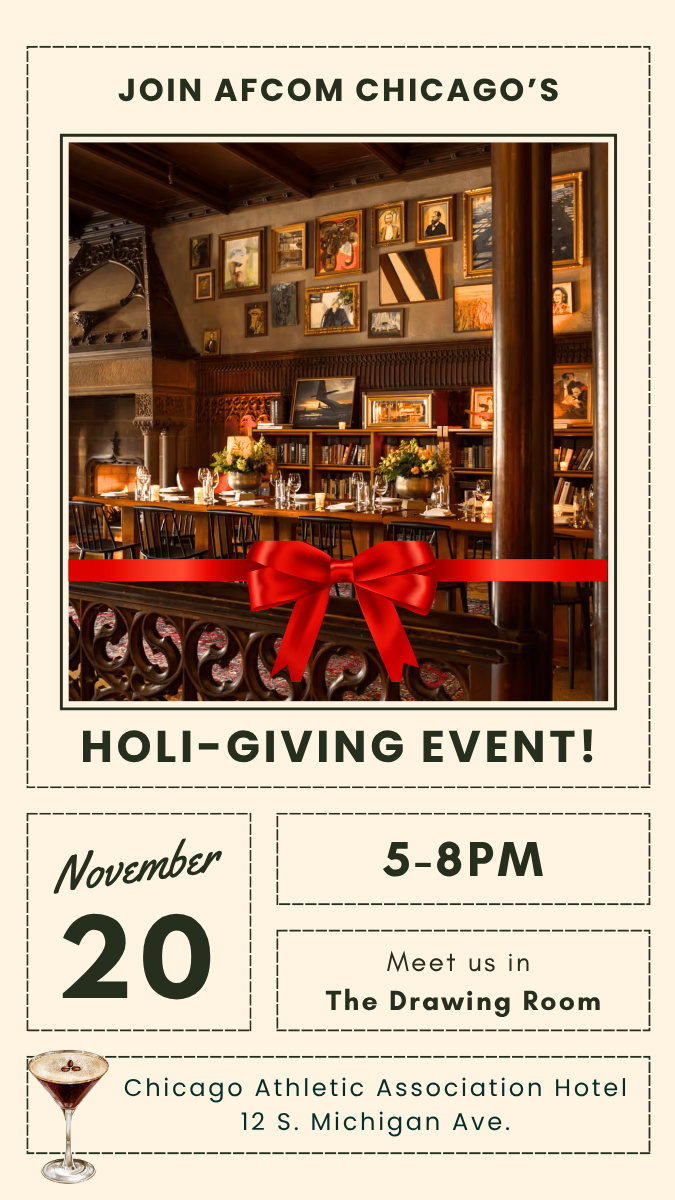 Join us in this classic venue for cocktails and hors d'oeuvres as we celebrate the season of giving! Due to space constraints, advance RSVP is required. AFCOM members & end users: Complimentary | Non-members: $75 Event sponsorships are available! Reach out for more information. A portion of the proceeds will be donated to the Greater Chicago Food Depository to help ease food insecurity this holiday season.
