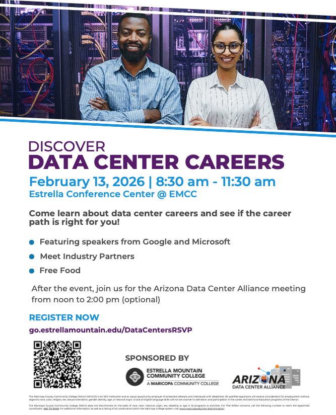 Join Data Center Career Day at Estrella Mountain CC! 📅 Feb 13 🕚 8:30 AM – 2:00 PM
