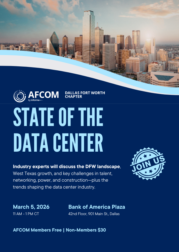 Not an AFCOM member? We appreciate your consideration of becoming a member of our AFCOM Dallas-Fort Worth chapter - Register Today! Annual dues include membership to national AFCOM resources and a primary local chapter. AFCOM members are able to attend any chapter event as a member.