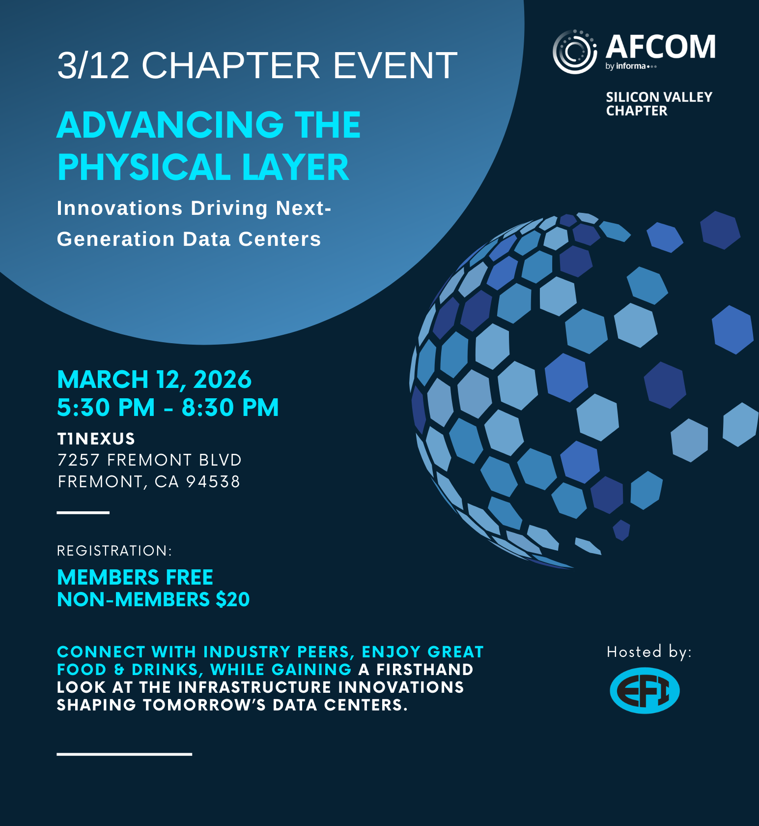 Join the AFCOM NorCal-Silicon Valley March 2026 Event "Advancing the Physical Layer: Innovations Driving Next-Generation Data Centers" Thursday, March 12, 2026 5:30 PM - 8:30 PM
