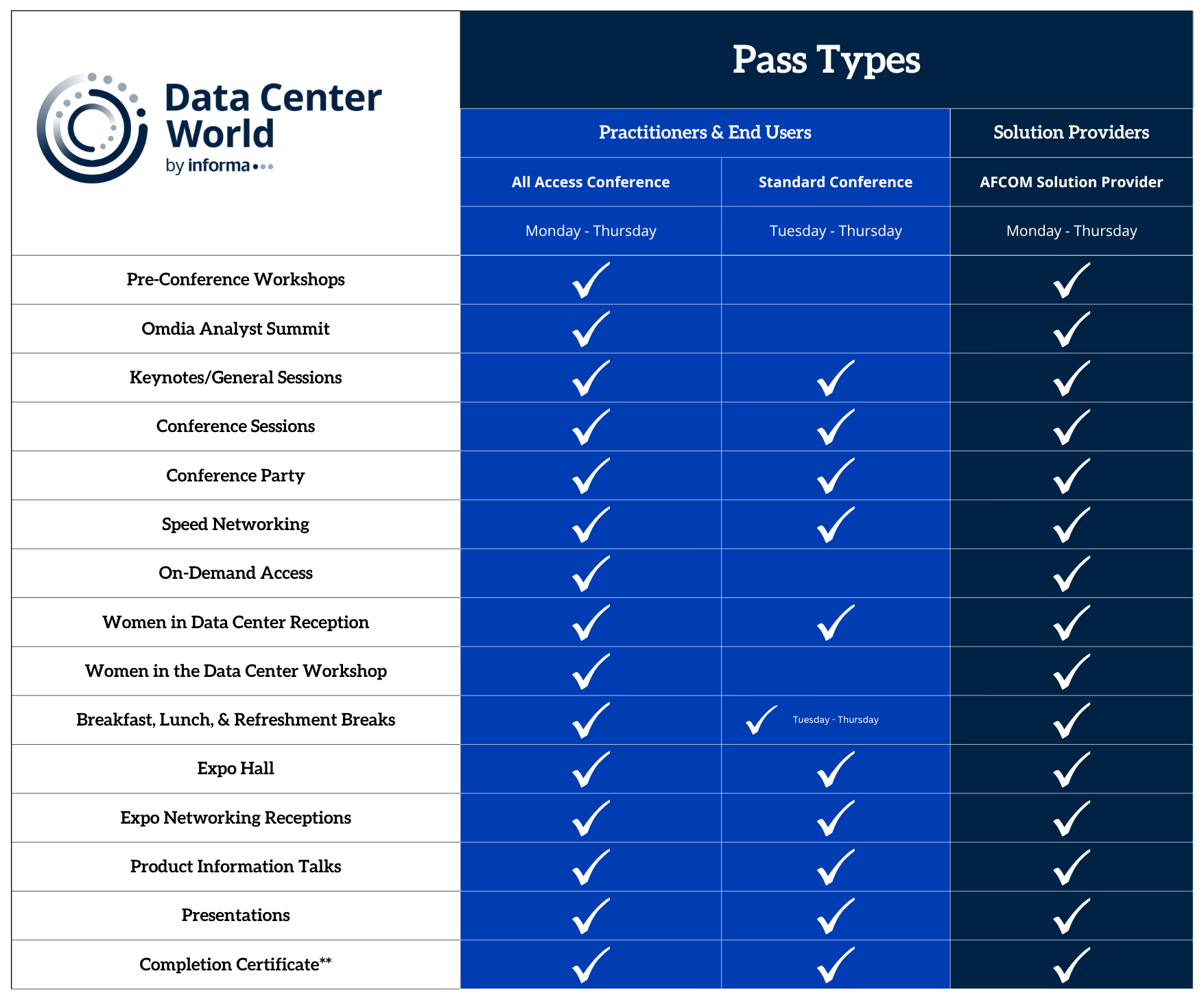 - This discount is not applicable to Solution Providers, the AFCOM Solution Provider Pass is already discounted.