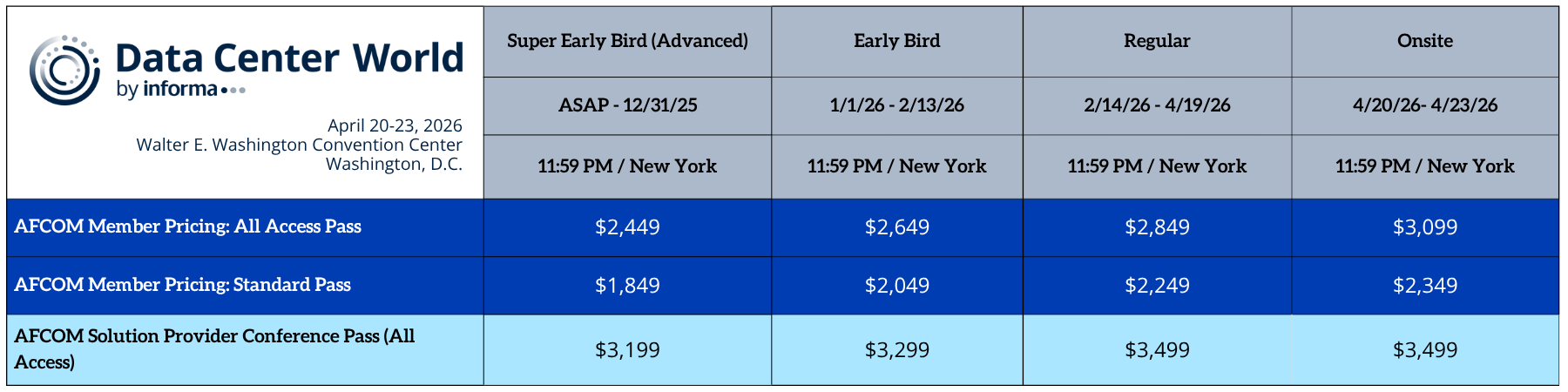 Being an AFCOM member has its benefits! Active AFCOM members enjoy special rates for Data Center World. How To Take Advantage of AFCOM Member Pricing for Data Center World 2026 - Active AFCOM should use this promo code: DCWAFCOM26